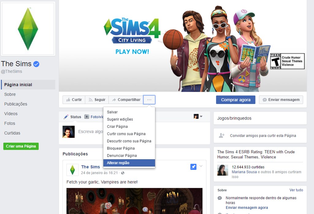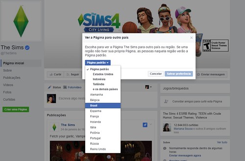 Mas não se preocupe! Isso não significa que você não poderá mais ver as Facebook Pages do The Sims de outros territórios! Isso porque agora o Facebook permite alterarmos a região daquela respectiva página, nos direcionando exatamente aonde queremos ir.
