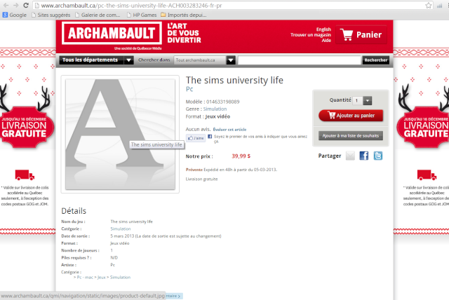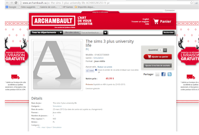 A Archambault – loja online canadense – catalogou há alguns dias o The Sims 3 Vida Universitária, tanto na versão normal quanto a versão que vem acompanhada do jogo base. As páginas foram excluídas, mas os usuários do fórum Rabiere and Co. conseguiram fazer uma captura de tela a tempo.