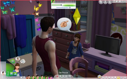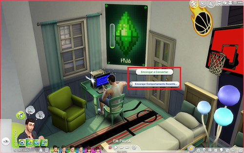 É possível perceber quando um sim ganha ou perde níveis de valores de caráter através da legenda que aparecerá constantemente sobre a cabeça dos Sims dependendo do que acontece e com o que interage a sua volta. A direita vocês podem observar uma seta para cima ao lado do valor de responsabilidade no painel, ela está indicando que houve ganho de pontuação.