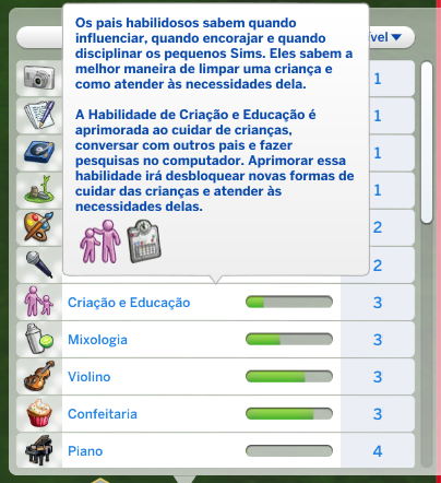 The Sims 4 Vida em Família também dá aos papais e mamães uma habilidade completamente nova que se chama Criação e Educação, esta habilidade pode ser aprimorada de muitas maneiras diferentes e tem tudo a ver com a interação direta entre pais e filhos. Dar conselhos, broncas, participar de atividades, aplicar castigo e até mesmo lendo no computador são muitas das formas diferentes para aumentar os seus pontos de Criação e Educação.