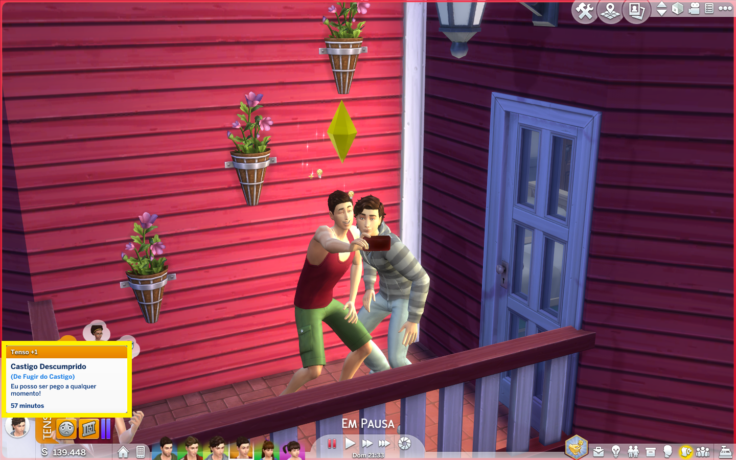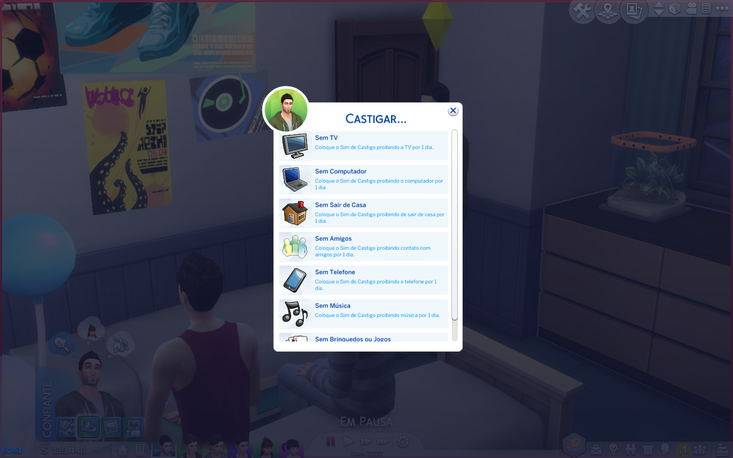 Existem 7 opções de castigos disponíveis para um sim adulto aplicar em seus filhos, e são: Sem TV, Sem Computador, Sem Sair de Casa, Sem Amigos, Sem Celulares, Sem Música, Sem Brinquedos ou Jogos. Os castigos possuem duração por um dia, e os Sims podem se meter en encrencas com os seus pais caso violem o que foi estabelecido. Aqui nós decidimos castigar o jovem Lucas chorão o proibindo de utilizar o celular.